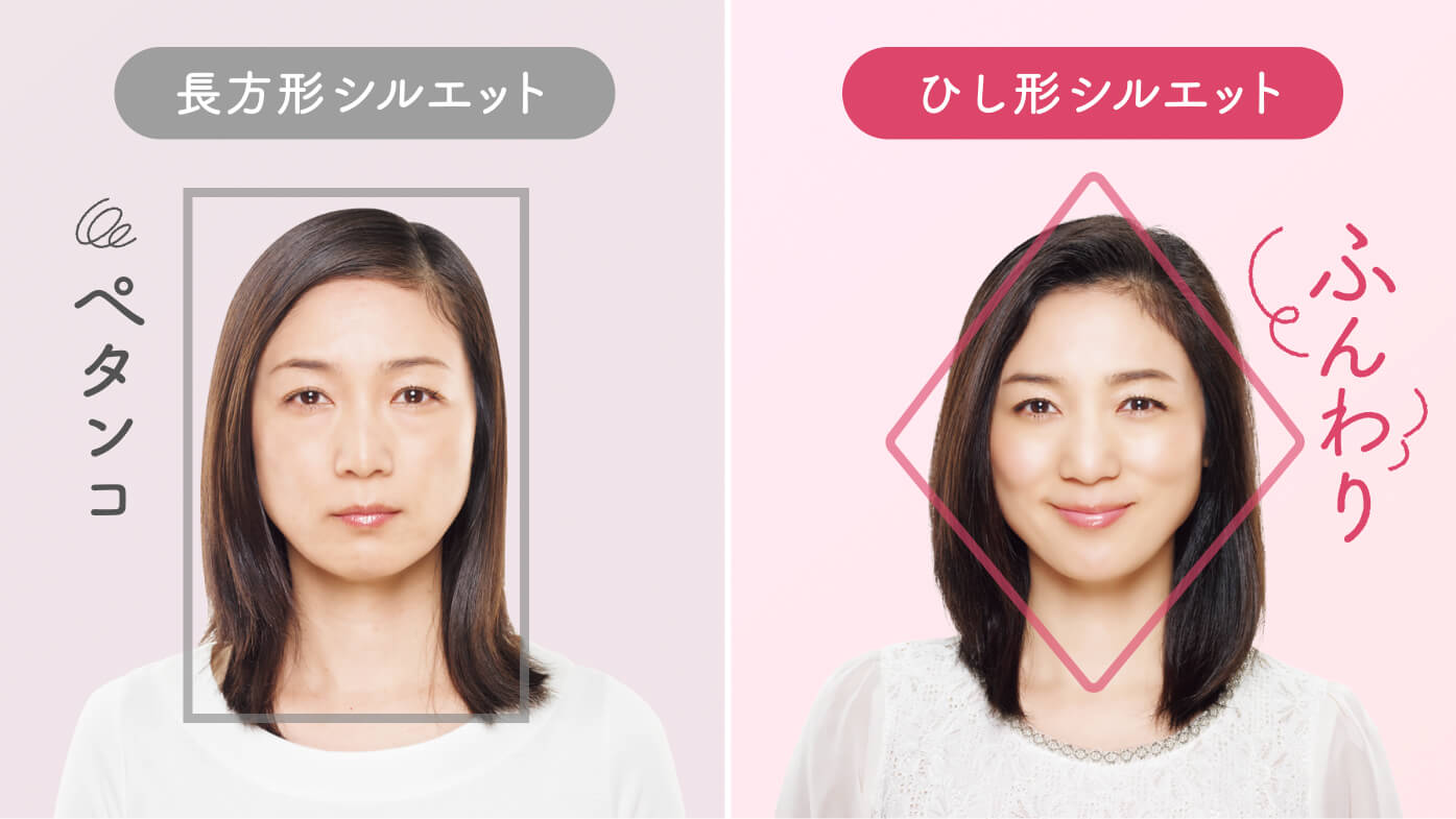 一方で、トップが自然に立ち上がり、頬のあたりにふんわりとボリュームが出た「ひし形シルエット」は華やかで若々しい雰囲気に見せてくれます。