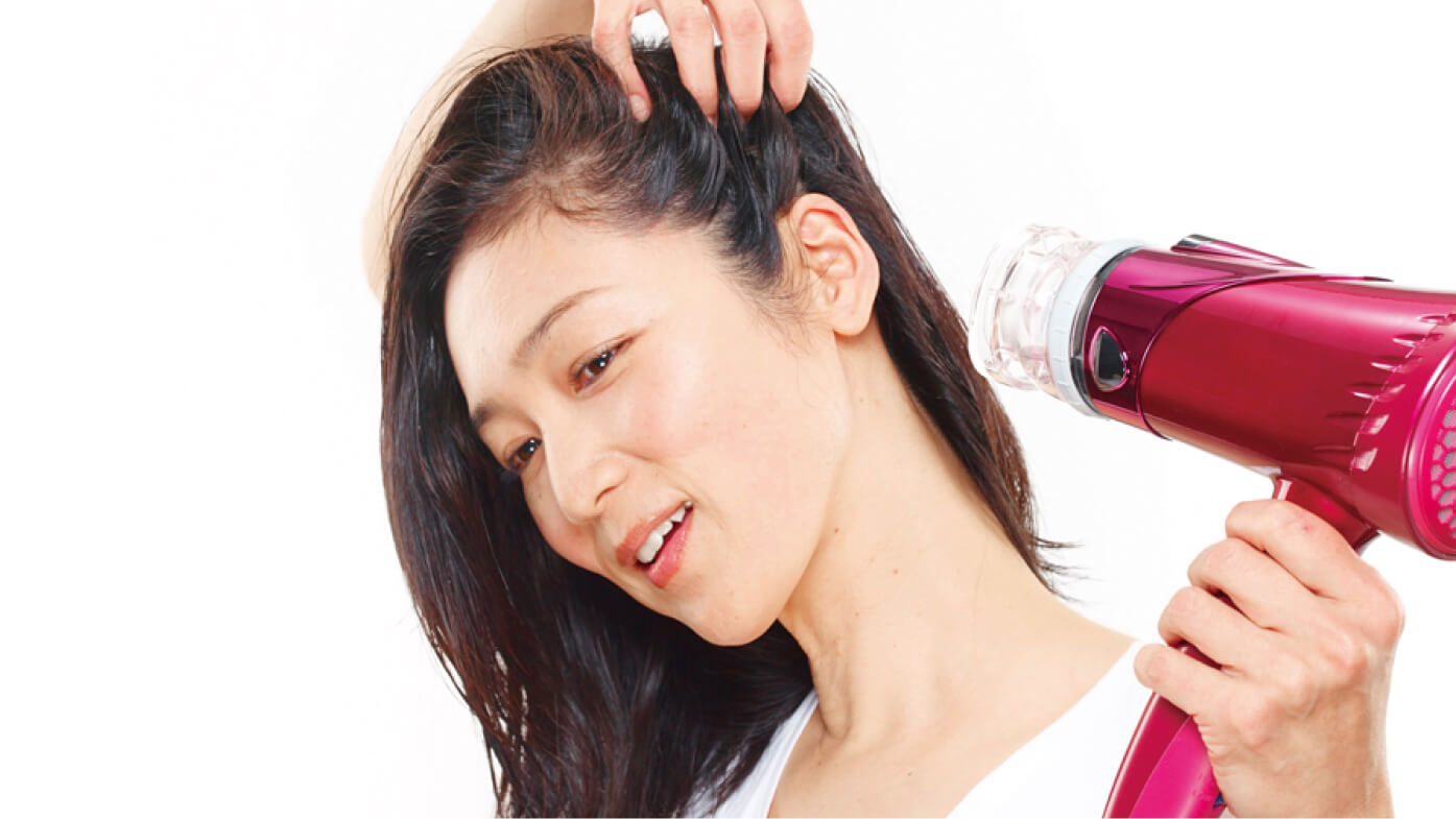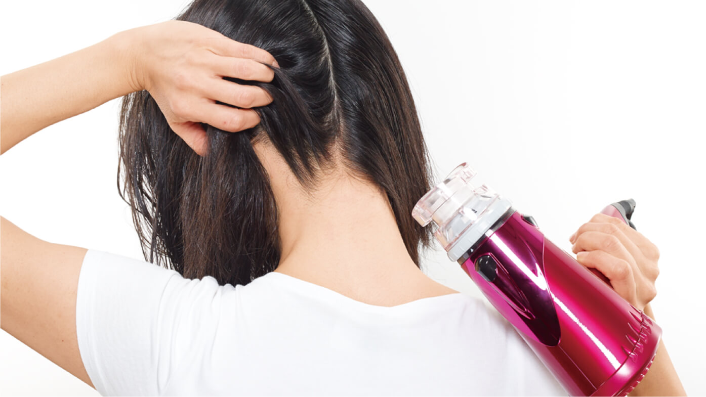 後頭部の髪を左右に分け、手で髪の毛を持ち上げ根元から乾かします。