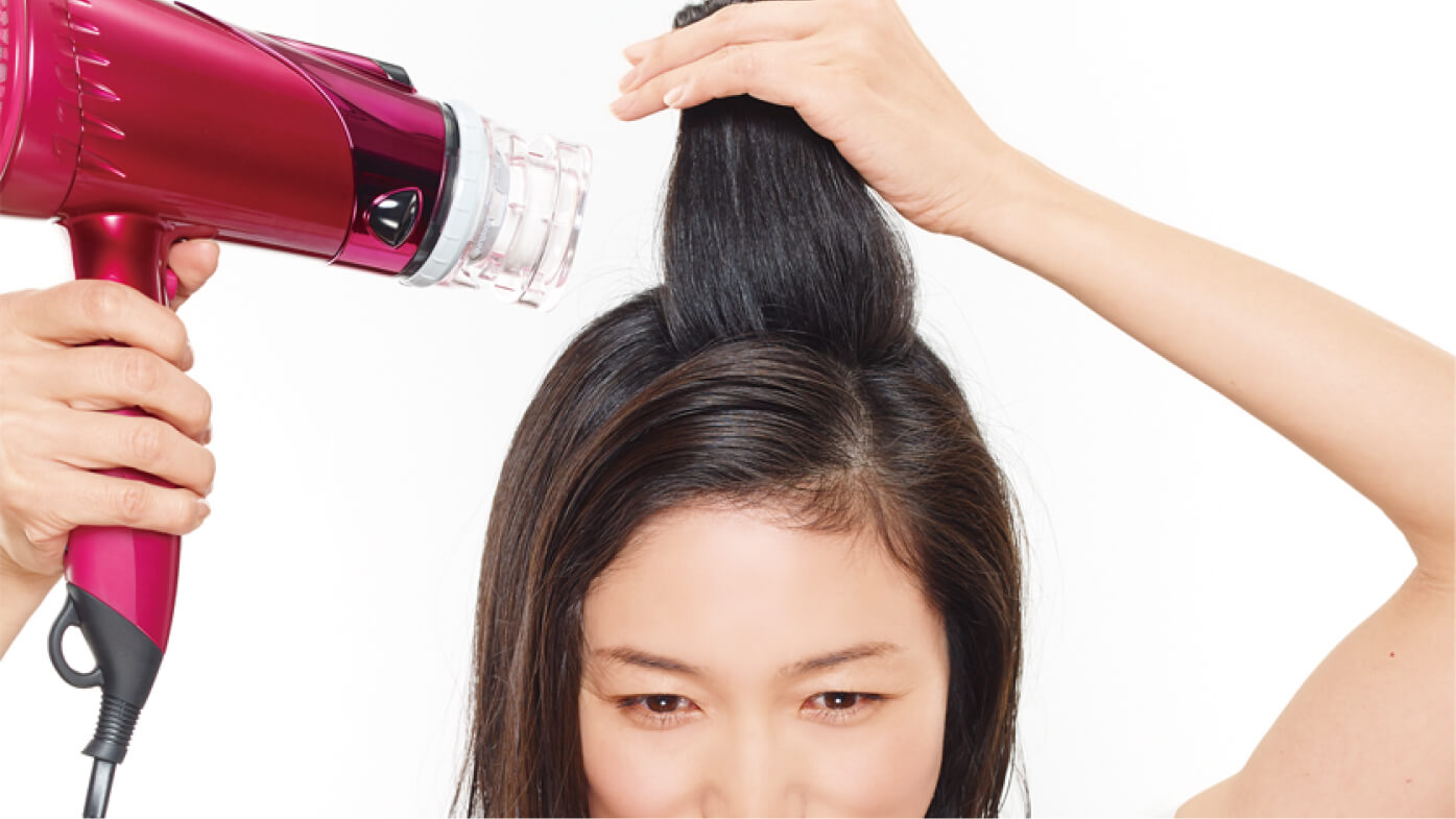 ボリュームアップのカギは、根元にあります。いつものように上から風をあてていると、トップはどうしてもぺたんとしやすくなります。大切なのは、毛流れに逆らって乾かすことです。