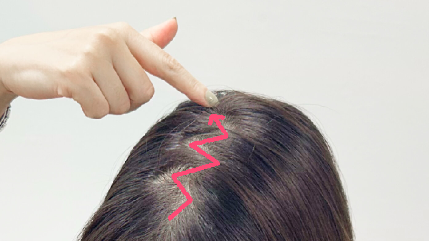 コームの先端や指で額からつむじに向かって、分け目の上に大きくジグザグを作っていきます。その後、髪を左右に分けなおすと、ふんわり感が生まれます。